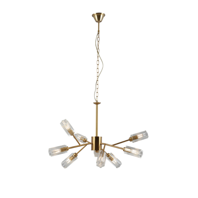 The main frame of the 9-Lights Glass Gold Chandelier is made with antique copper electroplating process and has passed a 72-hour salt spray test, ensuring an anti-coloring ability of five years. Strong Lighting UL/CE certified 9-Lights Glass Gold Chandelier is made of selected K9-grade crystal glass with a light transmission rate of over 90%, creating a gemstone-level light spot effect through light refraction. .
