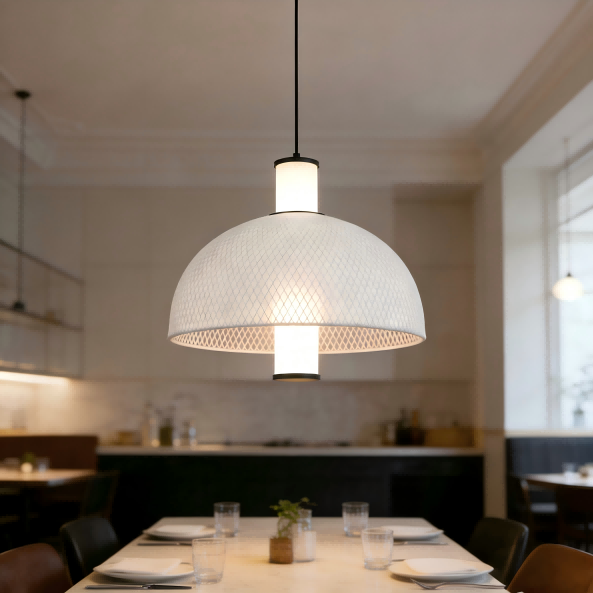 Натхненний передовими тенденціями дизайну на виставці Euroluce у Мілані 2025 року, цей мінімалістичний італійський підвісний світильник із шовкової сітки від Strong Lighting ідеально поєднує італійський мінімалізм із практичною функціональністю. Центральне світлодіодне джерело 15 Вт випромінює нейтральне світло 4000 К, створюючи комфортну атмосферу. Завдяки яскравості 1500 лм і високому індексу передачі кольору Ra>80 світло є природним і реалістичним, що робить його придатним для віталень, їдалень та інших приміщень. Круглий абажур у формі арки виготовлено із залізної сітки, обгорнутої навколо білої шовкової тканини, а матова чорна фурнітура оздоблена фарбою з балончика для додання текстури. Простий дизайн легко інтегрується в скандинавський, сучасний та інші стилі дому.