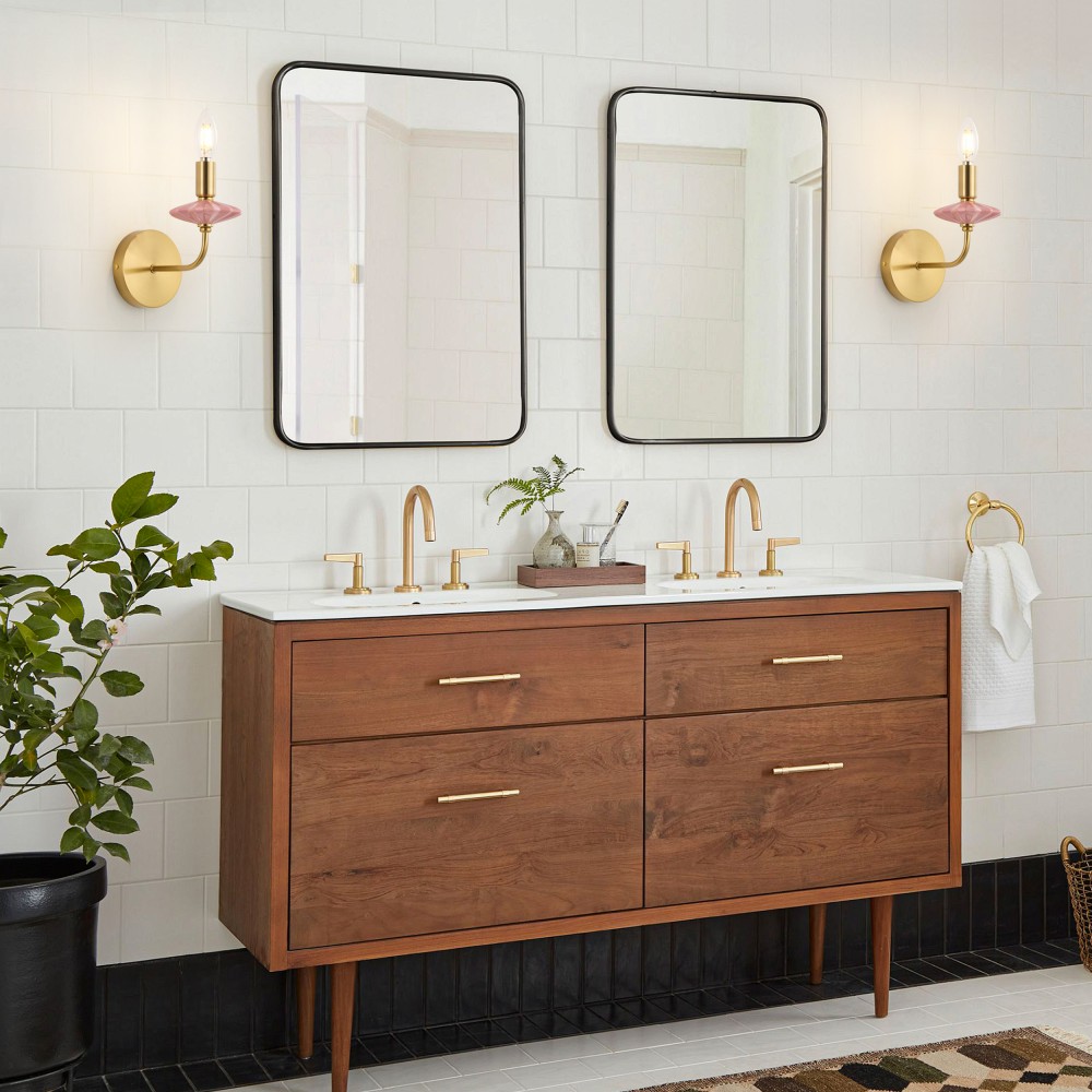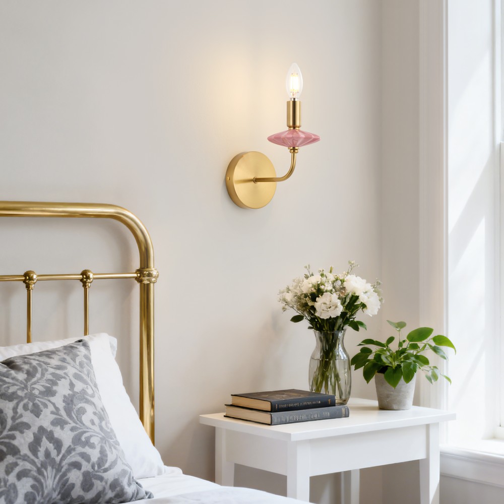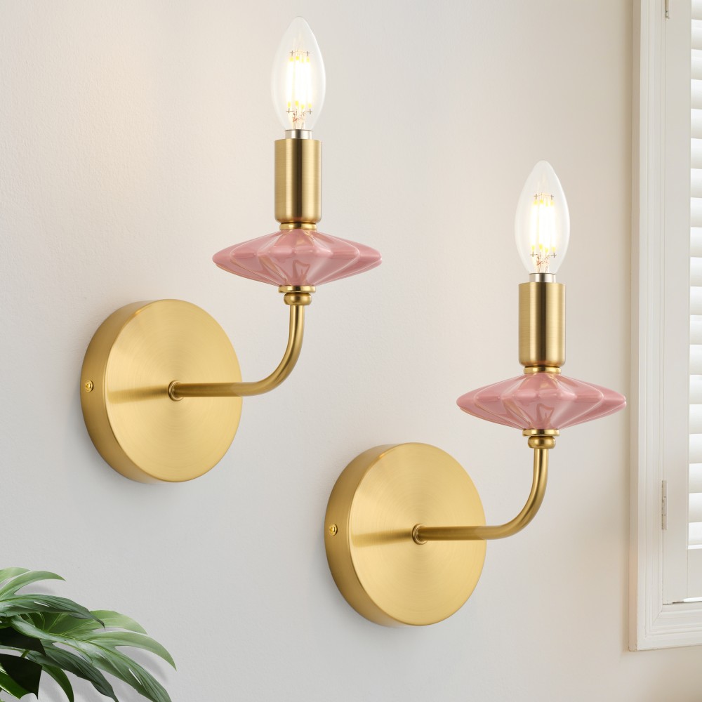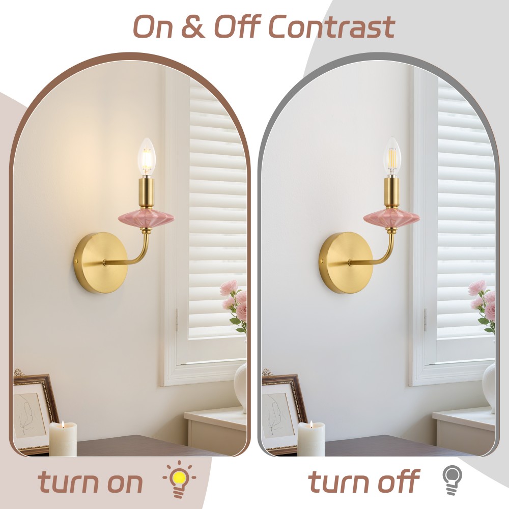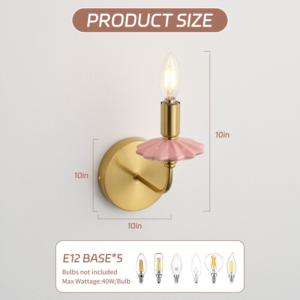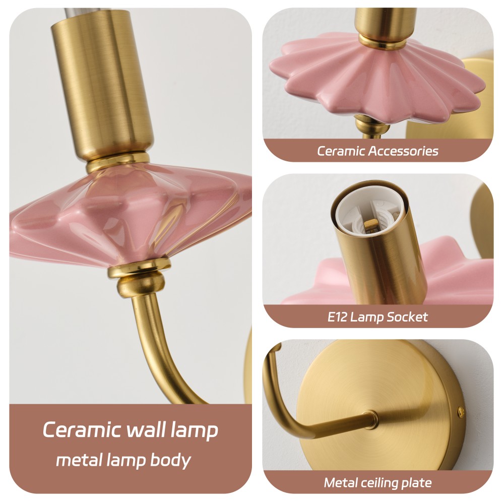 Виготовлений із ніжно-рожевої кераміки та багатошарової позолоченої фурнітури, це настінне бра для ванної кімнати поєднує в собі класичну форму свічки та сучасний розкішний стиль, шедевр сильного освітлення, що поєднує керамічні та металеві матеріали. Керамічні частини оброблені високотемпературним глазуруванням, що забезпечує гладкість на дотик і стійкість до вицвітання, тоді як позолочена фурнітура має чудову стійкість до окислення, що підходить для тривалого використання навіть у вологих ванних кімнатах у прибережних районах. Оснащений цоколем E12, він сумісний із традиційними та світлодіодними лампами, підтримуючи максимальну потужність 40 Вт на лампу. Тепле та холодне біле світло можна вільно перемикати, щоб створити різну атмосферу, з розмірами L200xW110xH210 мм, його компактні розміри підходять для різних внутрішніх стін.